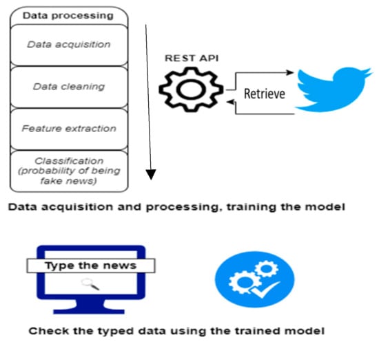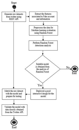 31] API. This dataset will be used to extract the features associated with fake accounts and information, which will then be further pre-processed in preparation for an evaluation of the effectiveness of machine learning detection using random forest. Following the completion of the analysis of the random forest, a suitable detection model will be acquired. After that, the model is transformed into an effective interactive design in preparation for its implementation. In the end, the program is tested using information that has been procured immediately from the Twitter API.
