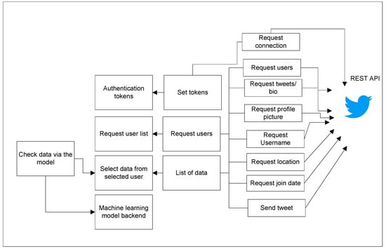 Before obtaining permission to retrieve data from Twitter, the data must first be transmitted to the REST API. After that, the REST API performs an additional check in order to protect itself from malicious users. Following that, the application submits a request to Twitter to retrieve users’ information. After the application has received the data, it filters the people and checks to see if any of them have the same name or a name that is quite similar. The program then transmits a GET request in order to retrieve data from the users who have been selected. Tweets, user biographies, and follower information are all recovered as data. The program constructs a feature vector for each user based on the obtained data and then feeds the trained model with the vectors in order to obtain a projected result about whether or not the profile has a similar fake account. The program tags the user who is the topic of the procedure and sends a tweet request to the bot profile. This process has been depicted in