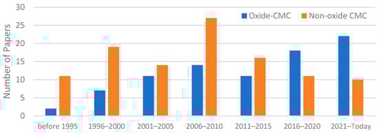 Figure 2 illustrates the growing interest in CMCs from the academic community. As can be seen, research on CMCs has been of constant interest since the 90s. However, it is obvious from Figure 3 that the research community has slightly moved its interest from non-oxide to oxide CMCs. In general, specific achievements, such as increasing the operating temperatures, introducing easier and more cost-effective manufacturing processes, and improving the thermal properties of the CMCs, resulted in more researchers being active on CMCs.