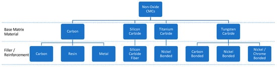 The most used structural non-oxide materials are silicon carbides, known as sialons, which are nitride-based ceramics with a wide range of oxide content. They are mainly processed in high-temperature environments with inert gases to reduce oxidation [87,88,89]. Non-oxide CMCs composition includes different matrices which can be used as base material and different fillers and reinforcements, as shown in Figure 5. The four main material matrices include carbon, silicon carbide, titanium carbide, and tungsten carbide.