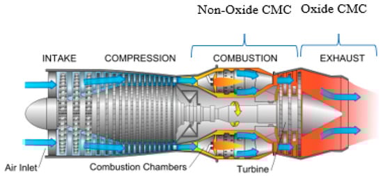 Literature suggests the use of aluminosilicate matrix CMCs in aerospace applications [77,78]. Until now, aluminosilicate CMCs have been used as environmental barrier coatings (EBCs) and thermal barrier coatings (TBCs) in the hot section of gas turbine engines [78]. Research has proved that aluminosilicate CMCs can replace nickel superalloys as they provide better temperature and corrosion resistance in oxidating environments [79]. NASA has also been implementing these types of CMCs in ultra-efficient engine technology by implementing aluminosilicate CMCs as a three-layer barrier coating system to avoid crack formation [80].