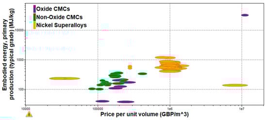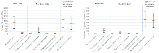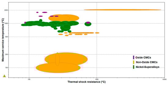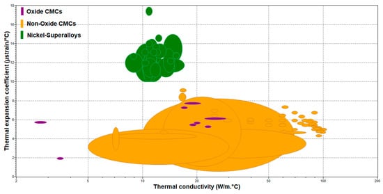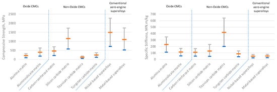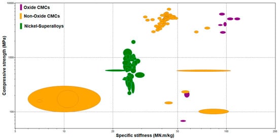 The focus of the present research is on the classification of the available oxide and non-oxide CMC materials. A high-level classification is shown in Figure 1. Furthermore, a literature survey of the CMCs used for aero-engine applications is presented and compared to CMCs that have already been used in aero-engine applications regarding their mechanical and thermal applications. For the critical analysis comparison of the discussed materials, Ashby charts have been drawn to help with the material selection. The results of this survey were focused on creating an available classification of the existing oxide and non-oxide CMC materials. Moreover, a material property investigation took place, allowing for the comparison of both mechanical and thermal properties of oxide and non-oxide CMCs. This material property comparison will also help identify the selection of the correct material for the needed application.