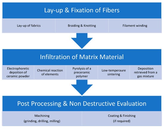The fabrication of CMCs quite frequently results in the generation of microcracks [118,124]. Carbon-fiber-reinforced ceramic matrix composites, however, exhibit fewer microcracks and allow for higher mechanical strength combined with lower density [125]. The manufacturing processes used to create carbon/resin composites are expensive and time-consuming. However, they are frequently preferred as they can be used in applications where a high strength-to-weight ratio and stiffness are required [126]. Many attempts to reduce the processing times and cost have allowed for the development of a large variety of fabrication methods, which create complex geometries without harming the fiber and protecting the composite from oxidation due to the reaction of carbon fiber with oxygen at any temperature as low as 500 °C [126]. Some of the most used manufacturing procedures are precursor polymer infiltration and pyrolysis (PIP), which turns out to be similar to the formation process of C/C CMCs, due to allowing for low processing temperature, easy-to-control ceramic compositions, near net shape technologies, and a range of complex reinforcements [127].