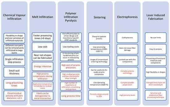 According to the literature review, composites made of carbon-fiber/metal-matrix will be the basis for the breakthrough in aerospace materials. They are high-temperature composites based on refractory metals and high entropy alloys, as well as on intermetallics [130]. Carbon ceramic materials have mostly been recorded to be used as fibers and fillers in metal base matrices creating metal matrix composite materials. More recently metal impregnated carbon ceramic matrix composite materials have also been researched. The base matrix of the composite includes carbon as the base material and a metal-impregnated carbon fiber as a filler reinforcement. Various manufacturing approaches for fabricating CMC composite and metal matrix composite materials have been tested.
