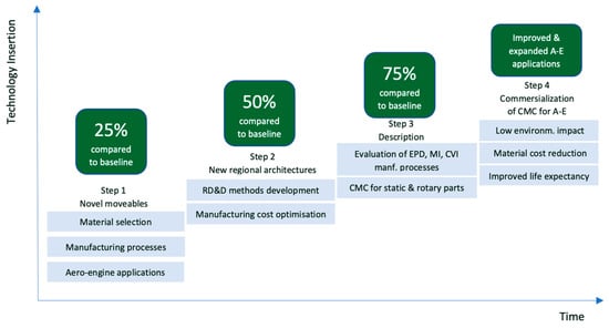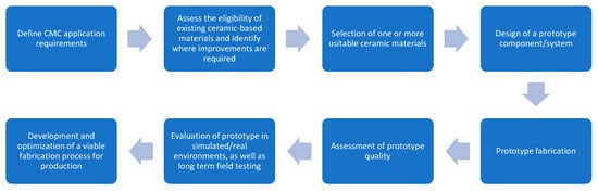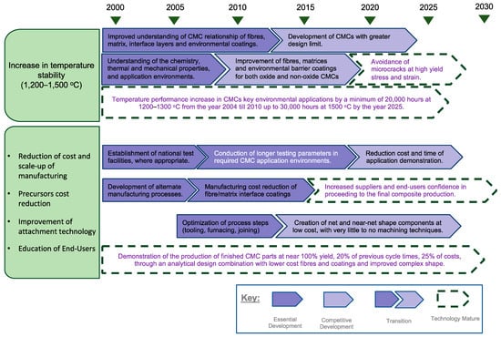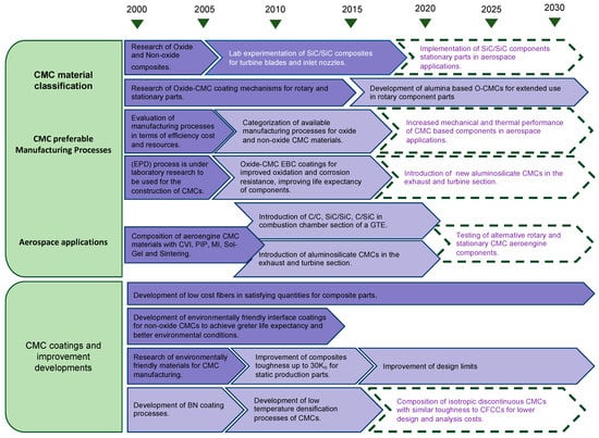 Development of CMC roadmaps is also conducted to address the engineering issues that must be resolved to increase the maturity of CMC materials and enable their deployment in aero-engine applications. The roadmaps are developed based on historical information on CMC materials and their manufacturing processes that were acquired from a literature review of internet sources released up until the end of 2022. The progress of oxide and non-oxide CMCs in high-temperature industrial and aerospace applications are discussed. Furthermore, the developed roadmaps will also discuss the progress of the applied manufacturing processes of this type of composite. To conclude, the technological achievements of CMCs in high-temperature applications are critically discussed according to the collected literature.
