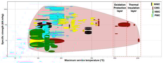 Such CMCs have high stiffness and strength. Such properties are, to some extent, achieved because of the control of microcracks in the interphase of the carbon matrix and fiber matrix and the fact that these are practically closed when exposed to high temperatures. They can be used in environments where temperature can approach 3000 °C [105]. In addition to their good strength and stiffness, they have low thermal expansion and good thermal shock resistance, as well as good creep and corrosion attributes. Their mechanical strength is increased with temperature [106]. Research indicates that the strength of advanced Carbon/Carbon CMCs can increase with temperatures close to 2000 °C. Furthermore, their properties vary depending on the fiber fraction, the type and structure of the carbon fiber, and the processing cycle used to fabricate the composite [107]. Therefore, they have higher stiffness, strength, and thermal conductivity across the fiber axis, while their mechanical and thermal properties are lower along the fiber direction.