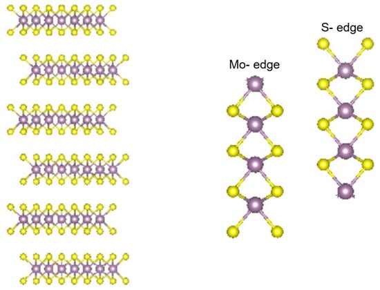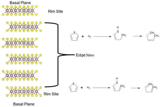 The predominant theory behind the reactivity of MoS2, TiS2, and WS2 has been the rim–edge model, in which the basal planes of the material are inactive. The activity of the edge/rim sites of the catalyst has been well studied [76,77,78,79]. The Metal and sulfur atoms on the rim or edge are the only species to participate in the reactivity of the catalyst [76,77,78,79]. A representation of layered TMS (showing the MoS2 lattice) and the metal- and sulfur-rich edges is shown in Figure 1 [80].
