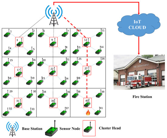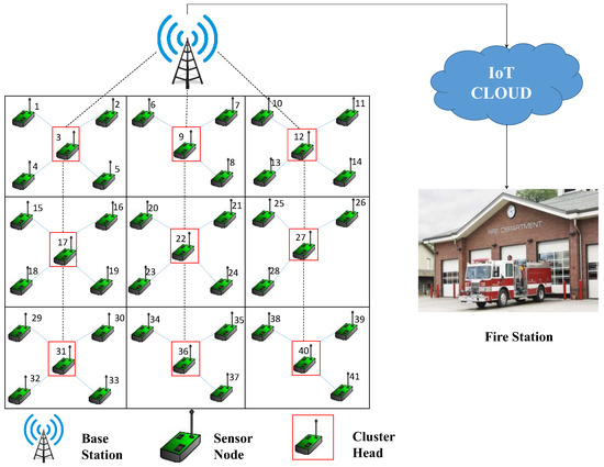 In the proposed model, the target area (forest area) is assumed to be divided into n equal-sized grids. All the sensor nodes are homogeneous and equipped with temperature sensors and global positioning systems (GPS). The sensor nodes are randomly deployed in the target area. Each node is capable of transmitting directly to the BS by varying its transmission power. The BS is located outside of the target area and is fully aware of the dimensions of the grids. The sensor nodes send data packets to the BS periodically. The BS sends the data collected from the sensor nodes to an IoT cloud. The data can be accessed by the registered Fire Stations. If an event (fire breakout) is detected, it is immediately reported by the sensor nodes to the BS. In this case, the data are immediately sent to the IoT Cloud, and thereafter, to the local fire station.