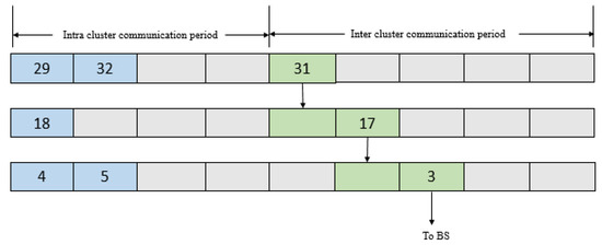 A frame is divided into two parts, namely intra-cluster communication period and inter-cluster communication period. In the intra-cluster communication period, sensor nodes send data to their CHs in the allocated time slots. In the inter-cluster communication period, a CH sends data to its upstream CH or the BS. The frame size is determined by the BS. A sample frame structure is shown in Figure 2. The frame structure is related to the network presented in Figure 1. The number of ordinary nodes in the largest cluster determines the number of slots in the intra-cluster communication period. The number of slots in the inter-cluster communication period depends on the number of clusters in a column and the number of clusters in a row in the network architecture. In the frame shown in Figure 2, there are four slots in the intra-cluster communication period and five slots in the inter-cluster communication period.