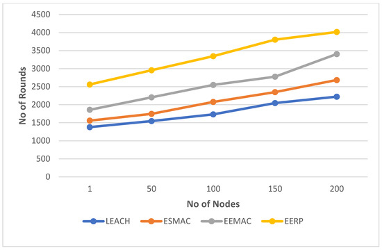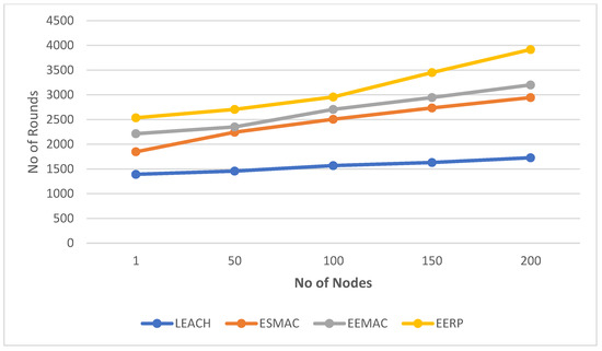 In the fourth scenario, there are 200 sensor nodes in a 50 × 50 m2 target area with 16 CHs. The outcomes of the simulations can be seen in Figure 14. Figure 15 represents the round numbers in which the FN and LN die in each protocol.