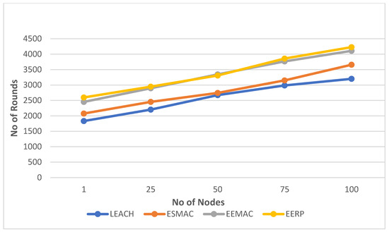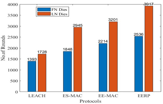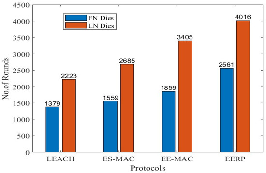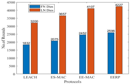 The third scenario involves the deployment of 100 nodes in a 50 × 50m2 area with 16 CHs in the target area. The outcomes of the simulations can be seen in Figure 12. Figure 13 represents the round numbers in which the FN and LN die in each protocol.