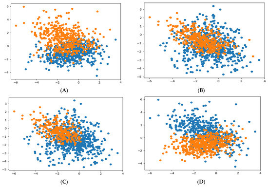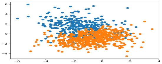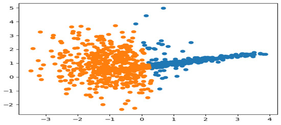 As stated in Section 3.2, there are several clustering methods that can be used for the management of the reliability and performance of the non-intrusive continuous sensor; among them are K-mean clustering, mini-batch K-means clustering, spectral clustering, Gaussian mixture clustering, birch clustering, density-based clustering, hierarchical clustering, and random forest clustering. All of these methods, however, can be successfully implemented to address the reliability and performance evaluation problems. In comparing the simulated results presented when the K-mean clustering model algorithm was implemented, the following model algorithms were applied in this paper to compare the simulated results: the mini-batch K-means clustering model, the spectral clustering model, the Gaussian mixture clustering model, and the birch clustering model algorithms. The simulation is implemented in the online Python 3 platform using the same dataset of 1000 samples obtained from the failure modes (6 features) of the non-intrusive continuous sensors. The simulated results for the different clustering model algorithms when the dataset is grouped into two clusters are presented in Figure 5.