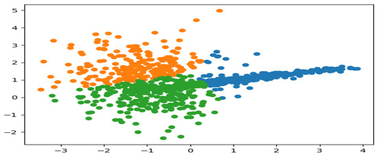 Similarly, the K-mean clustering algorithm was implemented for the six (6) features of the sensor by using the same test dataset of 1000 samples over the same period. The simulated results showing the fault state (blue region) and the non-fault state (orange region) for the two clusters and the normal state (blue region) and the abnormal state (orange and green region) for the three clusters, respectively, are presented in Figure 3 and Figure 4, respectively.