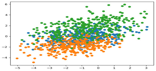 This is particularly important, as the failure modes are also entered as features used in the evaluation process using the clustering model algorithms for sensor reliability and performance. In the first instance, a test dataset of 1000 samples is generated, and two features in some particular period of the sensor’s operation are simulated, in which three states, that is, the normal state, the abnormal state, and the fault state of the sensor, are identified. However, this is obtained by splitting the data into two or three clusters, respectively. The results generated from the two clusters are used to determine the fault and non-fault states of the sensor. Similarly, the three clusters are used to determine the normal state of the sensor and the abnormal state. It is worth noting that all of the experiments were carried out on the same hardware and software platforms, with the following specifications: Intel(R) Core (TM) i5-3320M CPU @ 2.60 GHz, 4.00 GB RAM.