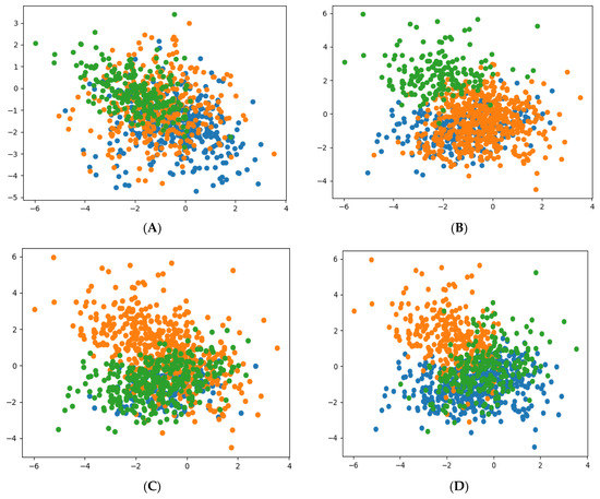 For the three clusters, a reasonable grouping was found, and it is represented by the colors blue, green, and orange. These colors indicate the normal state (orange region) and the abnormal state (green and blue region) for the mini-batch K-means clustering (A); the normal state (blue region) and the abnormal state (orange and green region) for the spectral clustering (B); the normal state (blue region) and the abnormal state (orange and green region) for the Gaussian mixture clustering (C); and finally, the normal state (green region) and the abnormal state (orange and blue region) for the birch clustering (D). The simulated results generate scatter and dense plots of the dataset, which are separated and identified by the different colors in the cluster. The clusters are generated by the association of the different datasets (observations) using the nearest mean. In Table 3, the simulated results for the clustering model algorithms that were implemented for managing the reliability of the non-intrusive continuous sensor are compared. The results show consistency with the K-Means clustering model algorithm, the spectral clustering model algorithm, and the Gaussian mixture clustering model, respectively.