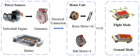 This study was conducted on a HEAGV with a series hybrid electric propulsion system, as shown in Figure 1. HEAGV has two modes (flight mode and ground mode), which can be switched freely. The series hybrid power system comprises a turboshaft engine, battery packs, a generator, four hub motors, and sixteen rotor motors. The turboshaft engine is completely decoupled from the drive system and can run under its best working conditions to achieve high efficiency. The engine generator set and battery packs are power sources for the hub and rotor motors. Eight pairs of coaxial rotors are used to generate lift in the flight mode of the HEAGV. In ground mode, the HEAGV is propelled by hub motors like a vehicle. The parameters of HEAGV are shown in Table 1.