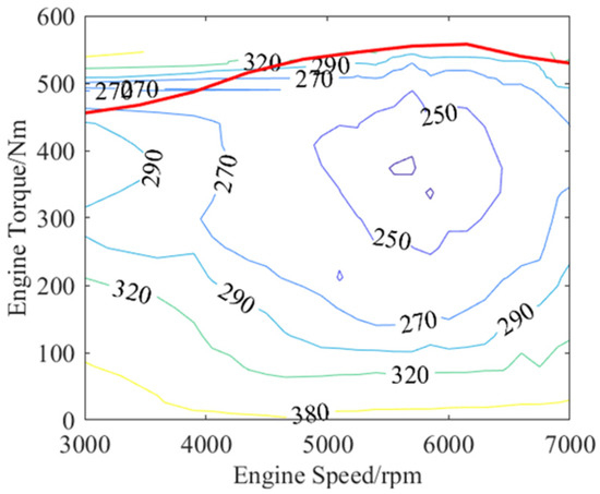 The experimental data modeling is simple, the simulation effect is superior, and the dynamic characteristics of the turboshaft engine can be ignored. Therefore, this paper chooses an experimental modeling method to model the turboshaft engine. The engine is controlled to make it operate at a fixed speed. The turboshaft engine fuel consumption map is shown in Figure 2. The instantaneous fuel consumption of the engine is determined by the engine speed and torque as follows