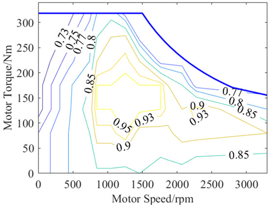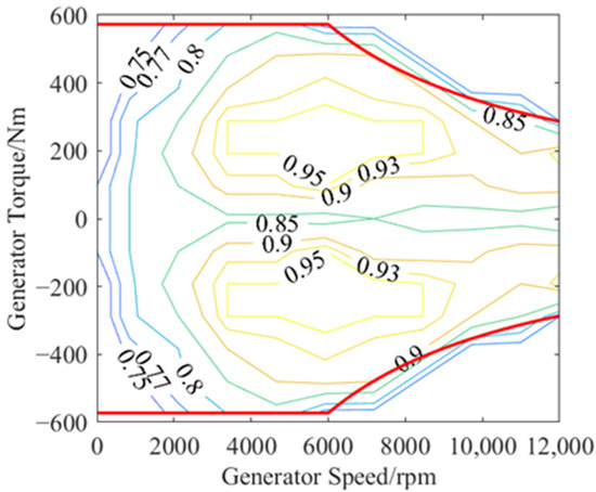 In the powertrain system, the generator is used to provide electrical power. The hub motor and rotor motor drive the wheels and rotor, respectively. The motors and generators are modeled using a quasi-static model. The efficiency characteristics of the motor and generator are represented by nonlinear three-dimensional plots of torque and rotational speed using data obtained from the manufacturer. The motor efficiency plots are represented in Figure 3 and Figure 4, respectively. The generator efficiency plots are represented in Figure 5. The motor efficiency at the operation point is calculated according to the following correlation
