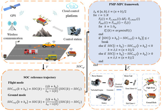 The HEAGV needs a lot of energy to take off vertically, and the hybrid pack and battery work together to provide the power needed. The energy required for level flight is constant. Compared to flight mode, the amount of energy expended on land is relatively small. In this section, a PMP-MPC EMS framework is proposed. First, In the intelligent network environment, HEAGV establishes information interaction with cloud and ground workstations and provides HEAGV with accurate speed information through environment-aware navigation and positioning technologies. Second, in the MPC framework, SOC reference trajectories are required for each prediction horizon, and SOC reference trajectories are segmented and planned. The energy management problem for each prediction horizon can be formulated as a multi-objective multi-constraint nonlinear optimization problem. Finally, the PMP algorithm is used to allocate the power and solve the two-point boundary value problem by the dichotomous method. The overall control framework of the proposed method is shown in Figure 6.