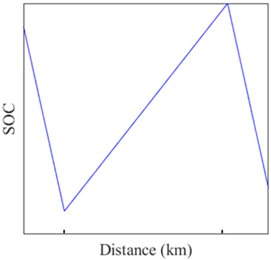If the SOC reference trajectory is appropriate, the optimized performance will be significantly improved in the MPC framework of EMS [31]. SOC decreases roughly linearly with increasing hybrid electric vehicle driving distance. However, the driving cycle of HEAGV includes both air and ground phases. HEAGV has a higher power requirement in flight mode than in ground phases which can lead to a large amount of electrical energy being consumed. If SOC has a linear downward trend, increasing the driving distance may exceed the SOC minimum. Therefore, the SOC reference trajectory of HEAGV is different from that of hybrid vehicles. The high power requirement of HEAGV while in flight mode leads to a large amount of electrical energy being consumed. The battery is discharged, and the SOC is on a decreasing trend. The SOC tends to increase when the HEAGV is in ground mode when the battery is charged to ensure proper travel. Therefore, this paper proposes a fast planning method for global SOC reference trajectory based on traffic information. The ITS system is used to obtain the average speed information of different road sections in the driving route and to segment the different modes of HEAGV. SOC reference trajectory is divided into two types according to the HEAGV working mode. Different formulae calculate the change of SOC of different segments. The SOC reference trajectory segments of HEAGV in flight and ground modes are expressed as follows.
