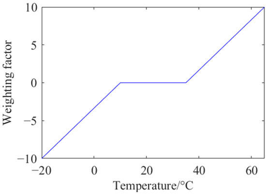 where is total cost function, and are fuel cost and battery temperature cost, respectively, is current time step, is the length of the prediction horizon, and is the prices of fuel. is the dynamics of the battery temperature, and is a weighting parameter depending on the battery temperature, which is related to battery temperature, as shown in Figure 8. The key to this additional cost is to penalize commands that cause the battery temperature to move away from its slow-aging operating range and to support commands that bring the battery temperature closer. The weighting factor will allow a trade-off between fuel consumption and safe battery temperature. There is no additional cost to run the battery at a safe temperature, with set to 0. On the other hand, when the temperature is too high, increases, and the higher the temperature, the higher the cost to prevent the temperature from rising further. In contrast, when the temperature is too low, the value of is negative, which is conducive to heating the battery and making the battery closer to the safe temperature. The optimum temperature range is 10~35 °C [32].
