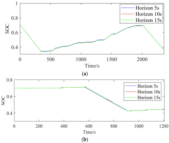 SOC profiles with different prediction horizon lengths. (a) SOC profiles with different predicted horizon lengths under driving cycle A. (b) SOC profiles with different predicted horizon lengths under driving cycle B.
