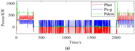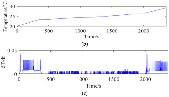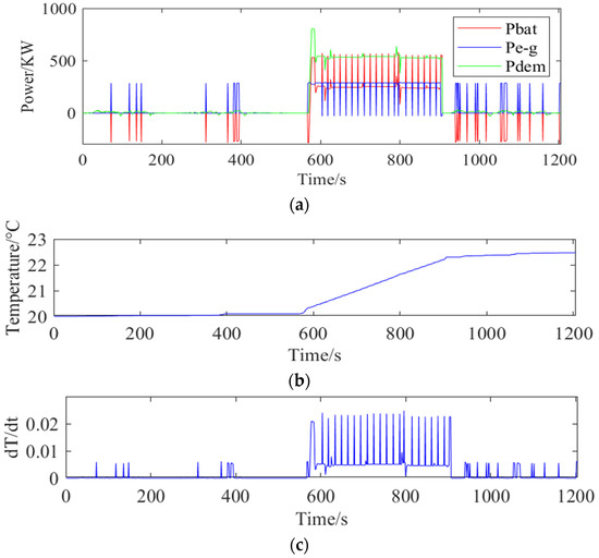 Validation of the PMP-MPC strategy under the air-ground driving cycle B. (a) The blue line represents the engine-generator set power; the red line represents the battery power; the green line represents the demand power. (b) Battery temperature profiles. (c) Battery temperature change rate per instant.