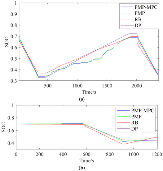 SOC profiles of different approaches. (a) SOC profiles of different approaches in driving cycle A. (b) SOC profiles of different approaches in driving cycle B. (Prediction horizon = 5 s for PMP-MPC).