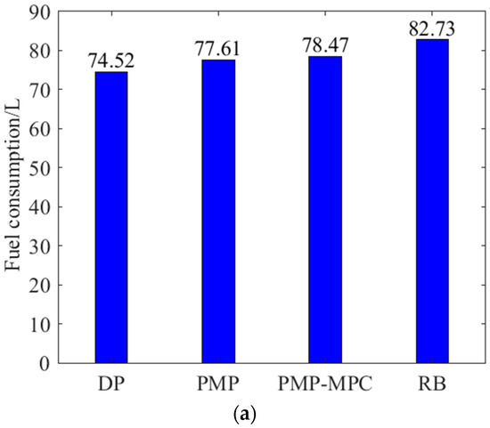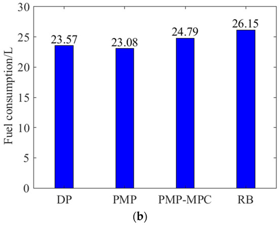 The results show that the proposed approach has higher fuel consumption than the global optimization approach because MPC-based EMS is essentially a local optimization algorithm. Overall, the PMP-MPC algorithm may provide a better alternative for developing an efficient and low-cost EMS. In addition, the RB-based method, although capable of online implementation and fast computation, has a significantly higher fuel cost.
