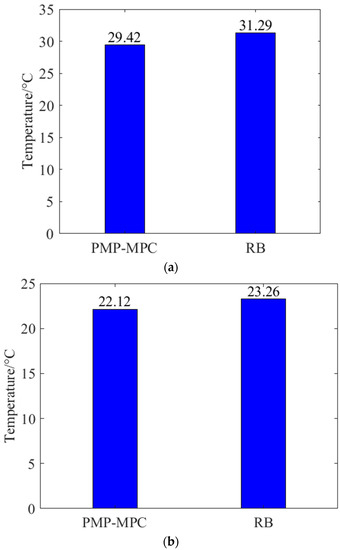 Battery temperatures for different methods. (a) Battery temperatures for different methods in driving cycle A. (b) Battery temperatures for different methods in driving cycle B.