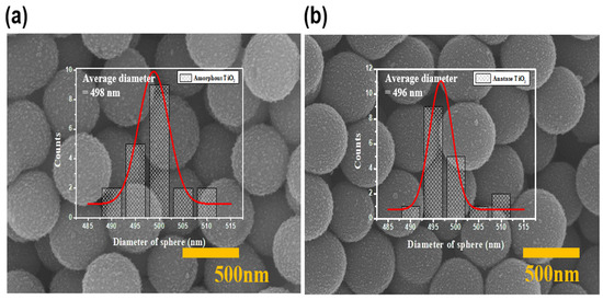 The surface morphologies of Am- and An-TiO2 NSs synthesized by solution-based synthesis method are observed by SEM as shown in Figure 2a,b, respectively. Figure 2a,b shows the uniformly distributed sizes and morphologies of as-synthesized and calcinated TiO2 NSs. The average diameters of Am- and An-TiO2 NSs were measured as 498 ± 5 nm and 496 ± 5 nm, respectively, as depicted in the inset of Figure 2. The summary of the size dependence of TiO2 NSs with respect to the mixed solution ratio is depicted in Table S1. Generally, the solution-based synthesis of TiO2 NSs is governed by a hydrolysis process [26]. Initially, the stepwise hydrolysis forms primary TiO2 hydrates with sizes of a few nanometers, which have high surface energy and small electrostatic charges. Hence, TiO2 hydrates agglomerate spontaneously owing to van der Waals attractive forces and hydrogen bonding among the individuals [27]. As the mass of the TiO2 hydrates increases by gradual aggregation of the individual hydrates, the electrostatic charges build up in the aggregated TiO2 hydrates. When TiO2 spheres achieve a certain critical size, the repulsive interaction becomes sufficiently strong to block the Brownian aggregation, leading to each TiO2 sphere being completely separate and without further increase in size.