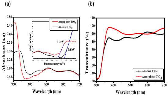 In addition, Figure 4b shows the transmittance spectra of the Am-TiO2 sphere and An-TiO2 sphere monolayers. The transmittances of the Am-TiO2 sphere and An-TiO2 sphere monolayers were, respectively, 91.1 and 83.9% at a 450 nm wavelength. The high transmittance of TiO2 spheres in the visible region resulting from their wide band gap and thickness of the monolayer indicates that TiO2 NSs monolayers can be used as a light extractor in visible LEDs.