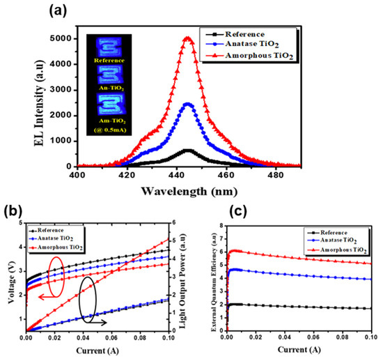 Structural properties of the synthesized amorphous TiO2 (Am-TiO2) and anatase TiO2 (An-TiO2) NSs were investigated by scanning electron microscopy (SEM) (S-4800, Hitachi, Tokyo, Japan), and a high-resolution X-ray diffraction (HR-XRD) system (SmartLab, Rigaku, Tokyo, Japan) equipped with Cu-Kα radiation (1.54 Å). Optical properties of the TiO2 monolayers were analyzed by ultraviolet–visible light (UV-vis) spectroscopy (Lambda 650S, Perkin Elmer, Waltham, MA, USA). To evaluate the light extraction and electrical properties of the LED chips with TiO2 NSs monolayers, light output power–current–voltage (L–I–V) measurements were conducted (Keithley 2400, Tektronix, Beaverton, OR, USA).