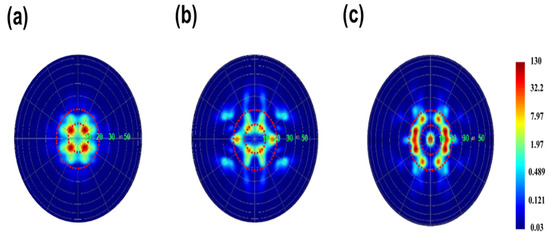 Far-field intensity mappings of (a) a reference LED and LEDs with (b) An-TiO2 and (c) Am-TiO2 NS monolayers.