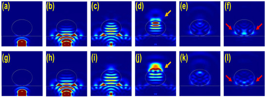 Evolution of travelling light via An-TiO2 NSs (a–f) and Am-TiO2 NSs (g–l) with respect to change of time. The red arrows represent the backscattering from the interface of air/TiO2 sphere to p-GaN.