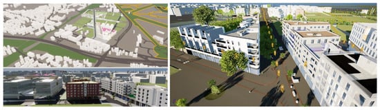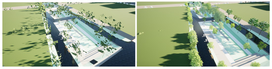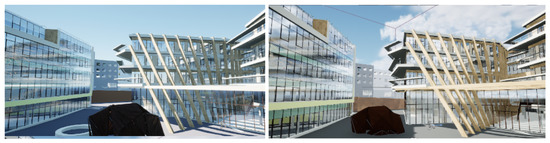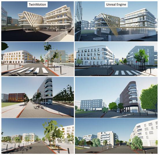 While GIS-based approaches are well documented, there is a lack of information on how a practitioner would proceed if he/she wanted to build a 3D city model from professional BIM files. AEC consultants use commercial tools such as the cloud-based technology BIM 360 [22], which facilitates the visualization of the city and existing infrastructure. Figure 3a illustrates a point of view of our district of interest: in this parcel are represented artwork from several buildings, as well as urban furniture data and landscape data (basically trees). For architectural consideration, BIM 360 is a powerful tool from a functional point of view, but the textures are mainly representative of what one can find in a typical virtual world. Such a digital twin is well adopted for design review, construction support, and stakeholder engagement [23], but lacks realism. It is useful for interaction, but personal imagination is needed to fill in the gaps of the cold textures’ impression and improve the immersive experience. Figure 3b illustrates the kind of results that are required for an immersive visit that would allow aesthetic and architectural ambiance study: much work is required in terms of texture replacement and lighting configuration. The game industry is able to deliver such a result using game engines such as Epic Games or Unity technologies [24], but game designers design graphically their own buildings without the need for BIM data, which is more a work of art than an integration of industrial processes.