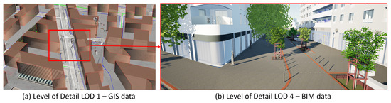 Most of the papers available in the literature about digital twins describe the construction of large-scale 3D models based on GIS data. These models are accurate at a mesoscopic level, the level of the city, which is adequate for urban planning purposes, but still, they are low-LOD models. These are typically 2.5D models consisting of a 2D footprint of a building with its elevation, as shown in Figure 2a, often times with a coarse texture extracted from aerial photogrammetry or from pictures acquired from a ground vehicle. Researchers expose their work designing their own tools or using common GIS software. The emphasis is more on the city scale and number of buildings integrated than on their aesthetics. If one looks at designing an immersive visit, a level of detail much greater is required, that is where BIM Level 4 is required. Figure 2b gives an example of the refinement that can be reached with BIM-based models.