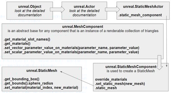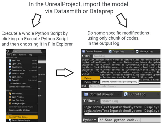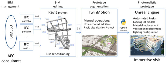 Figure 4 illustrates the workflow of the design: it goes from AEC software for handling architectural data to a game engine for photorealism and features’ augmentation. It starts with the collection of the 3D models by the BIM manager from all the AEC partners of the project. Each company is responsible for the CAD drawings of the buildings, road networks, terrain, public places, parking spots, urban furniture including lighting and benches, park and recreation furniture, fountains, and vegetation. The data are centralized through the BIM 360 cloud platform. All BIMs are registered to a common coordinate system with Revit and exported to a TwinMotion project. With this archviz software, it is possible to augment the project with the urban context of the real estate project, as a form of GIS model of the surrounding buildings and the network infrastructure of the city. A first prototype was built, which is very useful for rapid checking and first-hand visualization including the possibility of using VR head-mounted device. Yet, this prototype has been deemed too colorful and not realistic enough for a perfect immersion experience. Therefore, we decided to use the game engine Unreal Engine for the final part of the immersive visit design. In this article, we describe the automation of the tasks through Python scripts to render a more photorealistic architecture model of the district. These tasks included the loading of the TwinMotion prototype from the disk, material replacement for the buildings and vegetation mesh replacement, as well as the lighting configuration of the complete scene.