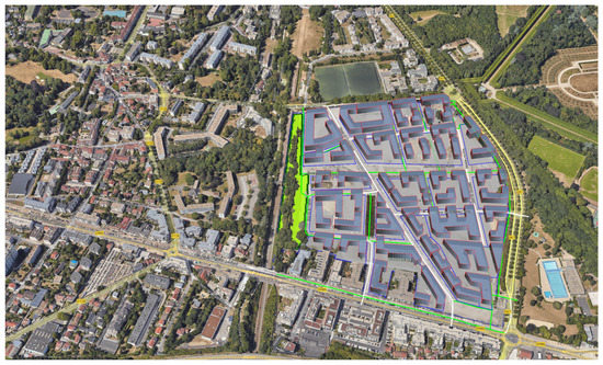 Because partners of the real estate project failed to choose the same reference point in their BIM, an alignment procedure was required. The map of LaVallée district, along with the absolute coordinates of the different parcels, different roads, and the mass plan, is represented in the following illustration (Figure 8). All the IFC files had to be aligned to the point , manually using Revit, which was time consuming since there are six parcels, one mass plan, and three road networks. Note that just the operation of loading an IFC file under Revit can take up to five to ten minutes. Figure 8 illustrates the resulting model after IFC repositioning.