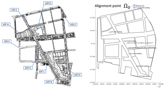 Left: Phase 1 of LaVallée on Revit with its parcels (lot), buildings and the road network (VOI). Right: absolute reference points of the parcels and the streets.