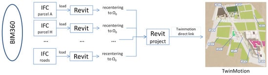 Figure 9 shows the diagram of the operations required to assemble and reposition the IFC files collected from BIM 360: once joined in a common Revit project, it can be imported into a TwinMotion project using the direct link plugin available under Revit or the Datasmith exporter for more recent versions of Revit.