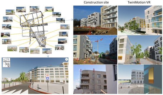 Another gap to be filled is the visual realism of the digital twin produced from BIMs: most of the AEC market is focused on the interaction and functionality of the 3D models. The digital twin should represent all the functions such as facades, gates, accesses, staircases, urban furniture, and vegetation in a geometrical way fitting the final product, but with little regard for the realism of their appearance, as illustrated by Figure 3. While realism is correctly established for indoor environments, as in the case of the virtual tour of the inside of an apartment, it is problematic if one wants to build a truly immersive visit of the neighborhood, its outdoor environment, and its public places. Architects are invested in the design of attractive spaces, but must also consider the senses and emotions that users may feel through the shapes and material, with maximum expressiveness in a minimum space. To do so, they can hire a firm to produce a cinematic marketing model of their building, but this would still need their integration with the work of other companies in charge of adjacent buildings for a holistic human experience. The subject of architectural ambiance using virtual reality is seldom tackled in the literature, usually addressed with mock-ups of structures representing buildings, but never with professional production, such as BIM files. The subjective feeling of presence is determined in a virtual environment by immersion and realism, which have to be integrated in a human experience in the perception of architectural spaces [25]. It is a necessary part for the study of the neuro-architecture concept on how architecture can affect our well-being: physically, intellectually, and emotionally [26]. However, to the best of our knowledge, no effort has been made in the literature to document the extension of a BIM-based model to a photorealistic architectural 3D model, especially in the case of a large-scale area requiring a large part of automation in this task.