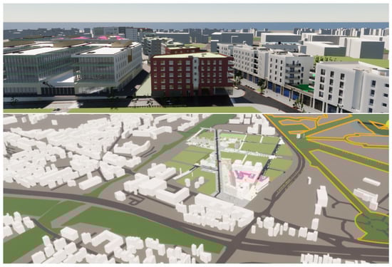 A first prototype of the immersive visit was made using archviz TwinMotion, as shown in Figure 10. Phase 1 of the real estate development modeled includes Parcels A, H, N, J, and G, which have been constructed and are illustrated, while Parcel O is now under construction, as well as the road networks, urban furniture, and landscape elements.