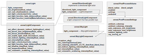 The parameters we want to set are illustrated in Figure 17. To do so, we do not want to directly set all the features in the light objects, because some parameters are only accessible from their LightComponent. Thus, for the light objects we want to use, we first obtain their LightComponent, which can be of various classes (unreal.LightComponent, unreal.SkyLightComponent, etc). See the Python code extract in Appendix E for a further explanation.