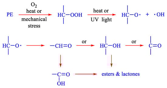 The interaction between oxygen and UV light causes polyethylene to begin to photodegrade. While photodegradation is the process by which molecules produce free radicals, photooxidation is the process by which polymers are destroyed by absorbing photons of visible, ultraviolet, or infrared light in the presence of oxygen [51]. Random chain breakage and photooxidation are the primary outcomes of photodegradation, and these processes in turn cause secondary crystallization and the creation of several degradation products, including carboxylic acids, ketones, and aldehydes, which are collectively known as carbonyl compounds [52,53]. The Norrish reaction can result in the synthesis of vinyl groups (such as unsaturated bonds and conjugated systems), and it is crucial to realize that hydroperoxides are byproducts of the free radical formation process [54]. In addition to the breakdown of hydrogen peroxide, Norrish types I and II processes involving ketone groups can also start the photooxidation of polyethylene [55], as shown in Figure 1 and Figure 2. Chain breakage and cross-linking are the primary and secondary outcomes of these three starting processes, respectively.
