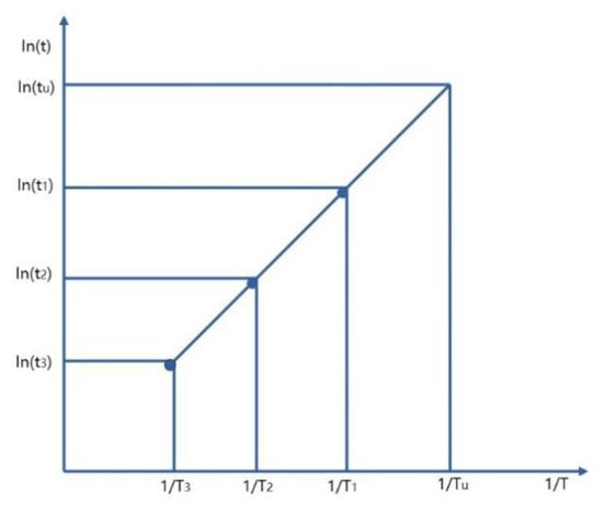 Accelerated aging experiments offer a reliable foundation for estimating the life of polyethylene materials. Temperature influences the time to failure or aging efficiency of polyethylene materials, and both factors are important for more accurately estimating the performance of polyethylene materials. The Arrhenius connection is the foundation of the most significant method for polyethylene aging. Svante Arrhenius, a Swedish chemist, presented the Arrhenius equation (Equation (14)) in 1889. It is an empirical chemical kinetic equation that describes the rate of reaction as a function of temperature [103]. The dependence of the kinetics of some simple chemicals’ chemical reactions on the critical element of temperature is extremely well described by the Arrhenius equation. The material produces a very modest reaction rate at very low temperatures, according to the Arrhenius equation, yet the minimum value will not be zero. The following conditions must be met to use the Arrhenius equation: (1) There must be only one main chemical reaction that causes thermal deterioration within a specific temperature range, and this significant chemical reaction should serve as the test’s starting point [104,105,106,107]. (2) First-order or other fixed-order kinetics govern the process of degradation [105,108]. (3) The degradation does not appreciably alter at time zero. (4) There has been no phase change [106,107]. (5) The experimental study’s temperature range was somewhat constrained to prevent the accuracy of the test results from being impacted by further degradation mechanisms [109]. (6) Throughout the test’s deterioration range, the activation energy should remain constant [110]. The non-exponential form of Equation (16) can be used to represent the Arrhenius equation, making it simpler to use and allowing for graphical interpretation [111]: