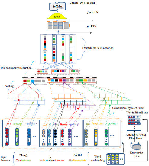 In contrast to ML approaches, models in deep learning techniques automatically learn and extract useful features. In NLP, such models use pre-trained word embedding (Google News, GloVe-6B, GloVe-840B, and Pre-trained Wiki), which play a significant role in encoding syntactic and semantic properties of words into fixed-size vectors to reduce the dependency on NLP toolkits [36]. In NLP, two commonly used models are RNNs and CNNs. CNNs and RNNs [41] have been applied to document and paraphrase classification [42,43,44] and relation extraction/classification [36,45]. In [46], a variant of CNN, multi-column convolutional neural networks (MCNN) is presented to handle multiple features in the question answering (QA) of candidate answers. An analogue of MCNNs for relational classification is proposed in [47], as the piecewise max-pooling network. In [29], using external BK (background knowledge), a well-known model of MCNNs based on [48] is introduced. By utilizing question and response sequences [8], the MCNN model enriches causality attention, which is in contrast with [29].