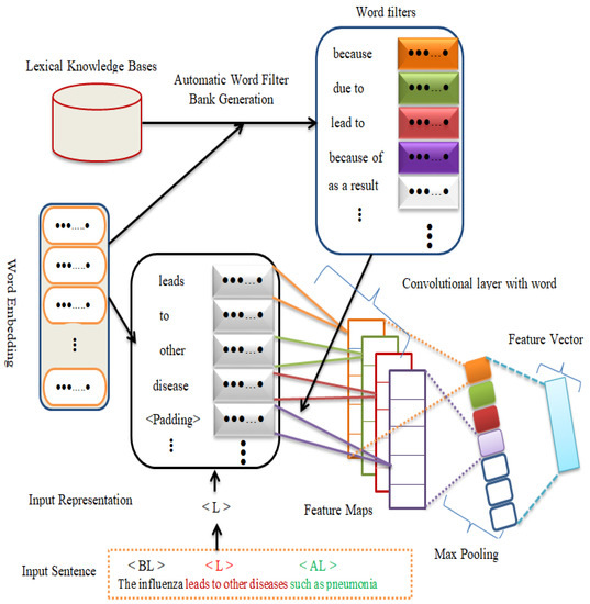 Finally, about 850 uni-grams, 240 bi-gram, and 20 tri-gram “wf” are created. During convolutional, “wf” is convolved with n-grams to obtain the important linguistic clues of causal relationships in the input text, resulting in a sequence of similarity scores. The proposed convolutional method is capable to capture semantically related causal words other than those that exist in the “wf” bank. We create several different filters for the L part of the input sentence, where each filter size ranges from 1 to 8 filter words. Similarly, we create different filters for AL and BL; each filter size ranges from 1 to 64 filter words. The convolutional “wf” for every “Lu” is formatted as in , , the weights of corresponding ‘wf’ are . Where is the word embedding of discovered by looking the word embedding table . Further, the convolved with input text matrix , where k is the convolutional window sizes (uni-gram, bi-gram, and n-gram). We follow [26], and modify the convolutional operation of each KCs so that each ‘wf’ becomes a future map , where signifies the similarity among the “wf” and the k-gram in input sentence. The improved convolutional method is represented by Equation (2).