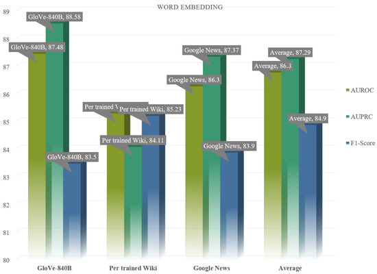 To understand more information about MCKN, we used both Areas under the Precision–Recall Curve (AUPRC) and Areas under the Receiver Operator Curve (AUROC) to estimate the specificity and sensitivity of the model. We evaluated the impact and robustness of different word embedding on performance. In the past, most tasks were based on a one-hot encoding and word-piece algorithm, different from pre-trained word embedding (GloVe-840B, Pre-trained Wiki, and Google News), used by our model. Table 4 shows pre-trained word embeddings with AUPRC and AUPOC scores, demonstrating the effectiveness of the proposed model.