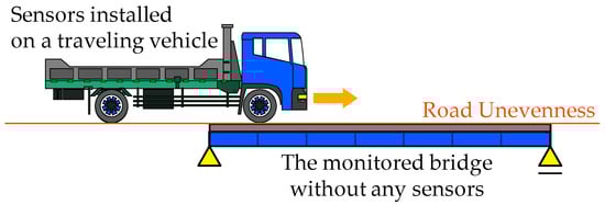 The applicability of this direct approach to the large numbers of old bridges poses various feasibility concerns related to bridge location, sensor affordability, and installation conditions. Another drawback to the traditional SHM method is the absence of information related to the intact version of the target bridge. These problems call for an alternative bridge monitoring method that is easy to be implemented, cost-effective, able to estimate current performance, and applicable to short-span bridges. One option to be expected to overcome these issues is to apply drive-by bridge monitoring technology. Drive-by bridge monitoring uses vehicle vibration data to evaluate bridge health conditions, as shown in Figure 1. This kind of technique has been investigated for decades [13,14].